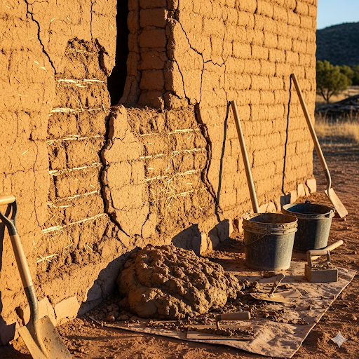 Large structural cracks are repaired by repointing (filling the mortar joint) or sometimes by installing compatible stabilization elements (like hidden tension rods) to secure the structure while preserving the original earthen wall appearance.